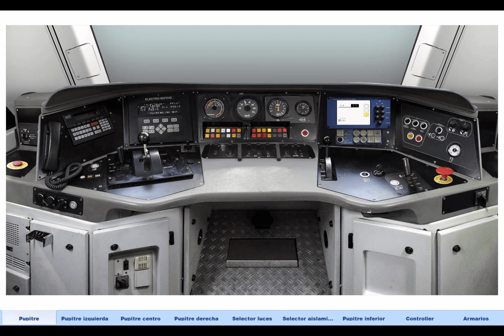 The new simulator has the primary real controls (traction regulator, automatic and direct brakes, inverter, emergency brake, driver safety devices and ASFA signalling…) located as per ergonomically designed criteria and addressing the most realist arrangement possible. The rest of the controls are simulated on three touch screens, respecting the original distribution of the locomotive and include tabs to access the so-called virtual cabinets, simulating the controls accessible to engine drivers located outside the operator’s desk.