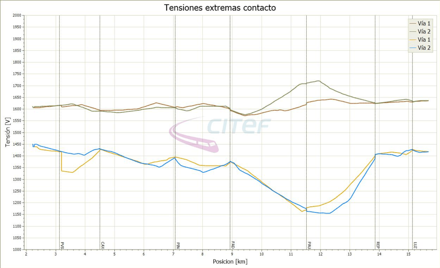 Posteriormente, foi desenvolvido o modelo para o sistema elétrico de tração formado pelas subestações retificadoras de tração, os condutores (alimentadores e catenária) e o sistema de retorno e terra. Nos cálculos realizados durante a simulação se considera a potência que os trens demandam ou regeneram em cada instante, a configuração do sistema elétrico e a potência entregue pelas subestações, entre outros aspetos. Para sua análise, em cada um dos cenários considerados foi estudado tanto o funcionamento normal de todas as subestações como os casos degradados simples, em que falha um dos grupos retificadores, e duplos, em que toda a subestação de retificação deixa de estar operativa, para cada uma das subestações da linha. Além disso, para os casos em que os resultados elétricos obtidos se encontravam fora dos limites aceitáveis, os intervalos degradados de operação foram calculados e verificados.