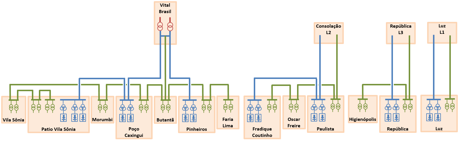 In the medium-voltage analysis, the AC electricity distribution system from the primary substation, electrical connections with other metro lines and traction substations and other auxiliary systems were modelled, considering the characteristics of the conductors on each of the circuits and the consumptions of stations and other line equipment. The temporal evolution of all variables was simulated, taking account of the energy called up by auxiliary systems and traction substations at each point in time, and also considering the energy returned to the system by the reversible traction substations, and again analyses were carried out on normal-operation and degraded-operation scenarios.