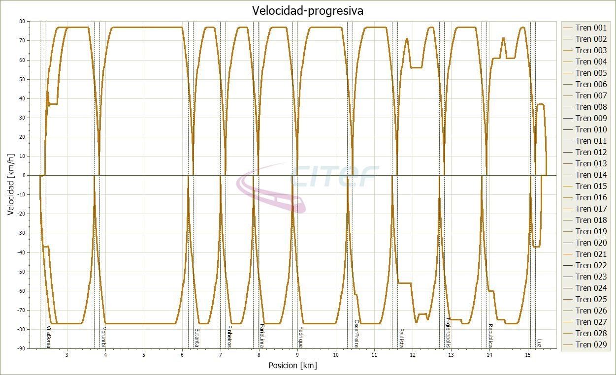 The study was composed of 5 different phases. The first phase focused on the line’s initial operating situation, adding one more station during each of the following phases. In each phase two headways (90 and 106 seconds) were considered, along with two train load scenarios: in the first scenario the trains ran with the maximum number of passengers, whereas in the second they ran with a load determined by demand, variable at each platform.