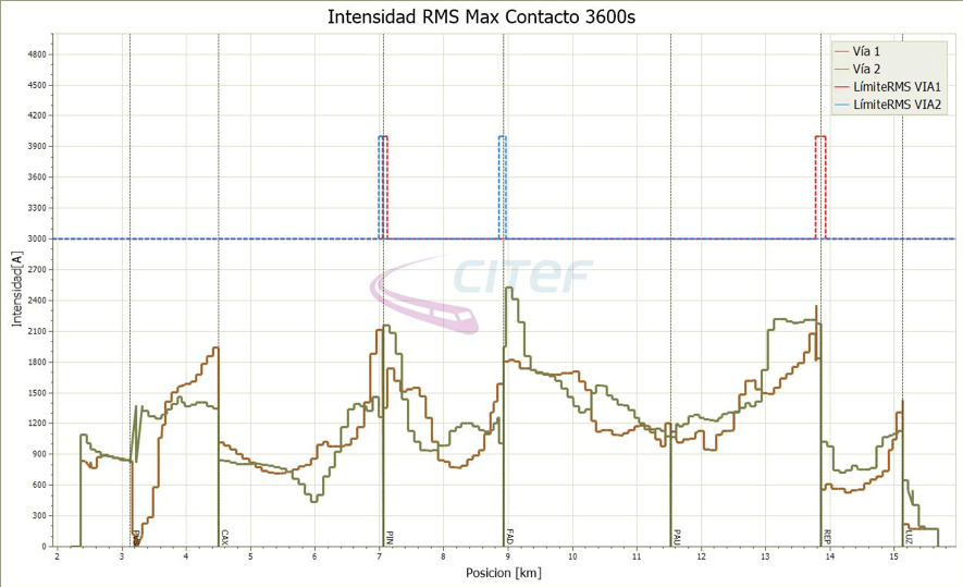 Subsequently the model was developed for the electrical traction system composed of the traction rectifier substations, the conductors (feeders and catenary) and the return and earth system. The calculations performed during the simulation consider the power output which the trains call on or regenerate at each point in time, the configuration of the electrical system and the power output delivered by the substations, among other aspects. To carry out this analysis, for each of the scenarios considered, a study was made of the normal functioning of all substations and also of single degraded situations, in which one of the rectifier units fails, and double degradation, in which the entire rectifier substation ceases to be operational, for each of the substations on the line. Also, for cases in which the electrical results obtained were outside acceptable thresholds, the degraded operation intervals were calculated and verified.
