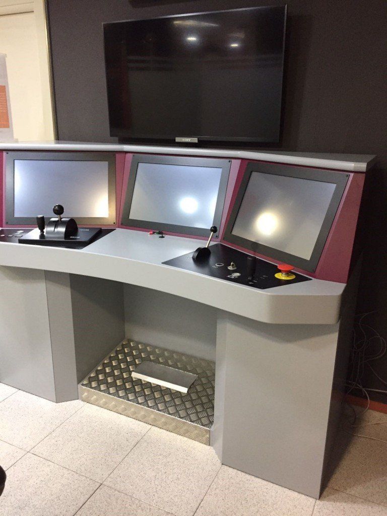 The new simulator has the primary real controls (traction regulator, automatic and direct brakes, inverter, emergency brake, driver safety devices and ASFA signalling…) located as per ergonomically designed criteria and addressing the most realist arrangement possible. The rest of the controls are simulated on three touch screens, respecting the original distribution of the locomotive and include tabs to access the so-called virtual cabinets, simulating the controls accessible to engine drivers located outside the operator’s desk.