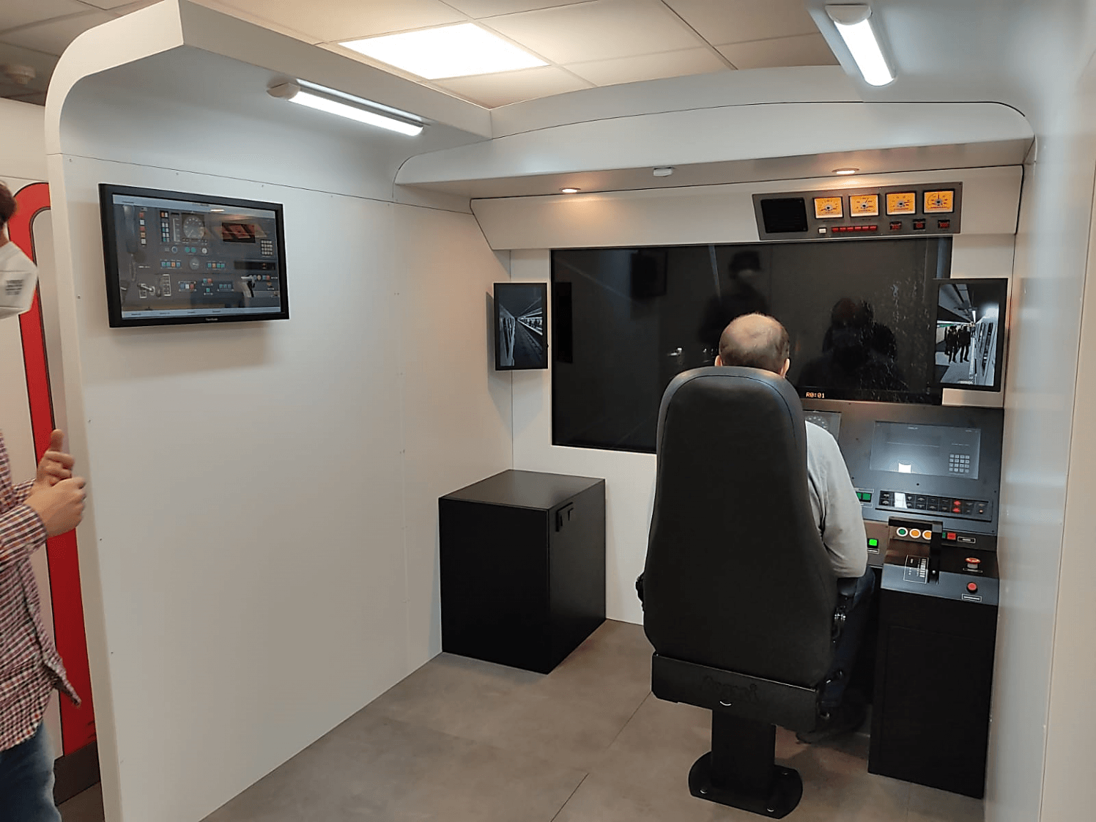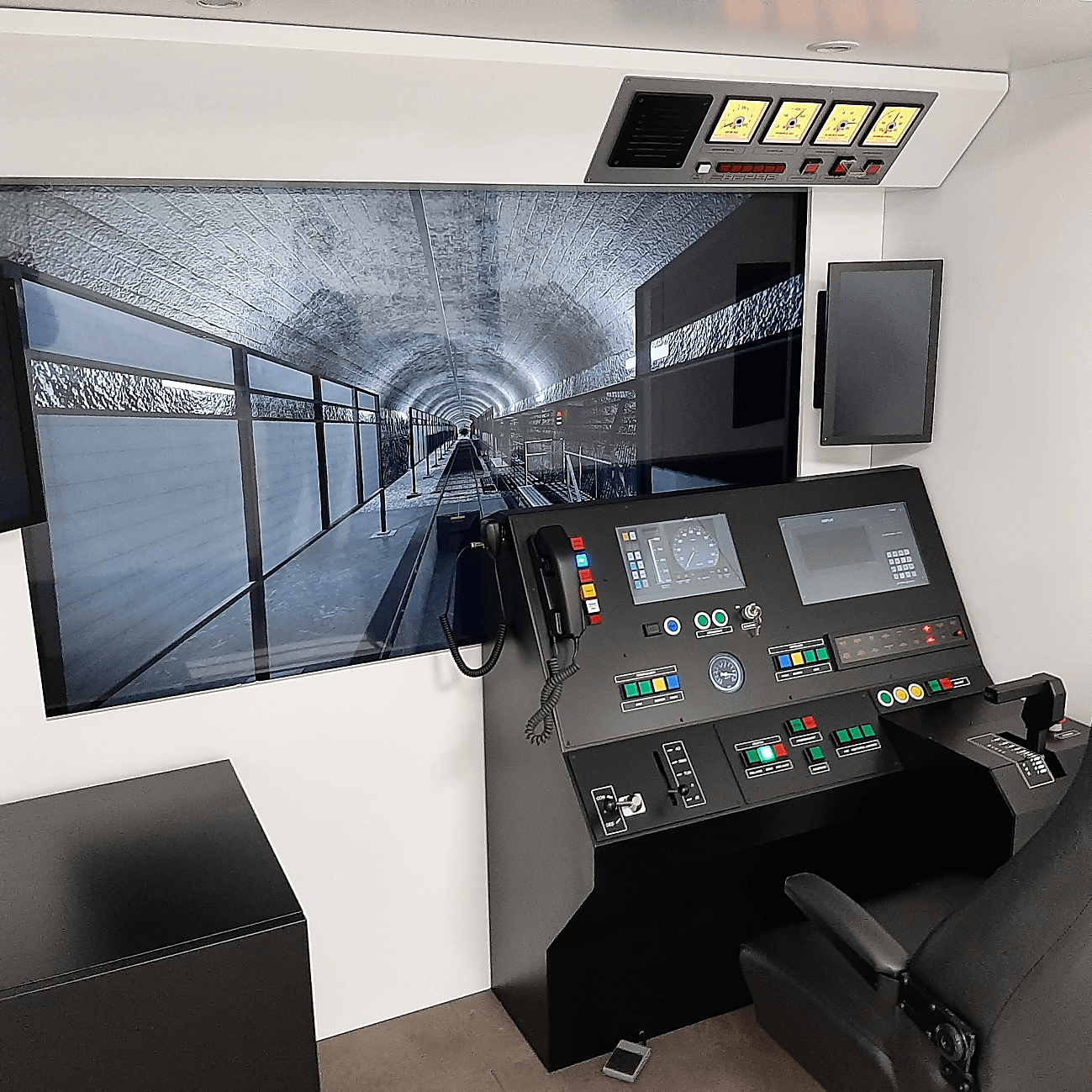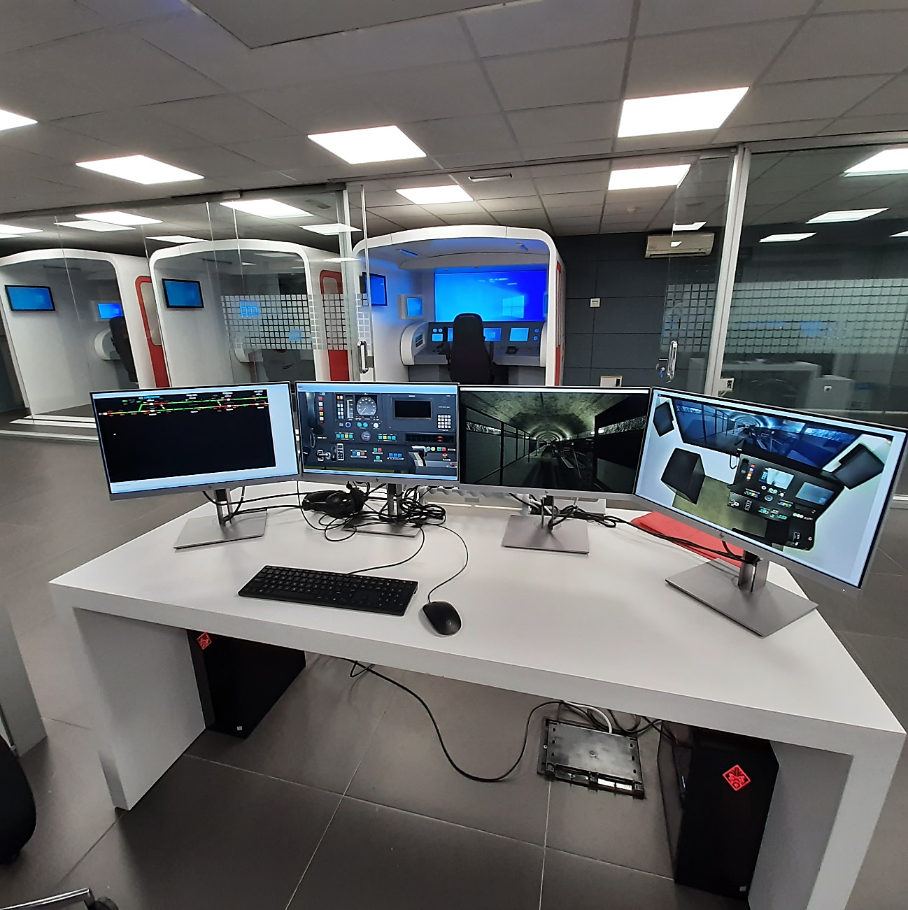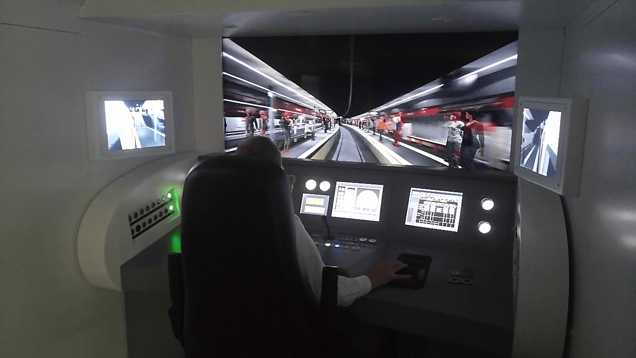 - Las cabinas de conducción reproducen fielmente el espacio de conducción del tren real. Cuentan con un visual de última generación de alto nivel de realismo, basado en un motor Unity, que completa la inmersión en el escenario. Además, en una pantalla táctil adicional, se encuentra a disposición del alumno todos los térmicos, válvulas, puertas y armarios que un motorista necesita conocer y usar dentro de la unidad tren, a través de una interfaz intuitiva y didáctica, incluyendo operaciones como cambios de cabina.