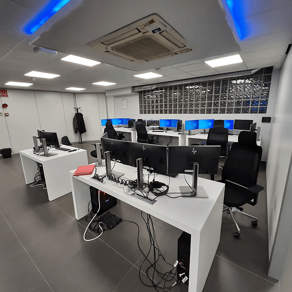 - Sala de observación: Esta aula con capacidad para 12 personas permite familiarizar progresivamente a los alumnos con los contenidos a entrenar. Con dos televisores de grandes dimensiones, el instructor puede mostrar contenidos teóricos, proyectar grabaciones de ejercicios desarrollados o compartir la evolución de una simulación en curso.